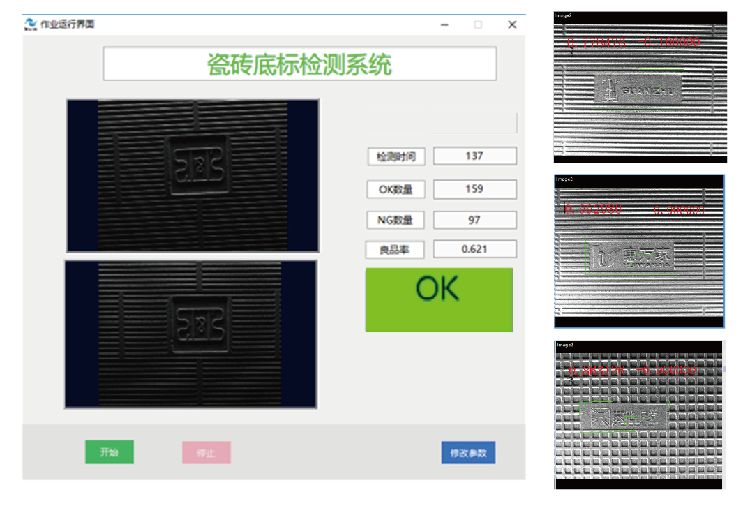 應(yīng)對勞動力成本攀升和自動化升級的需要,針對陶瓷行業(yè)多種品牌瓷磚混燒下磚時有其他品牌瓷磚混入的情況,開發(fā)了窯尾陶瓷底標(biāo)識別系統(tǒng),識別非目標(biāo)品牌并進行剔除,同時能夠支持目標(biāo)識別品牌的快速切換,便捷的的作業(yè)設(shè)置,簡單的參數(shù)調(diào)節(jié),應(yīng)用于TOP陶瓷生產(chǎn)企業(yè)。